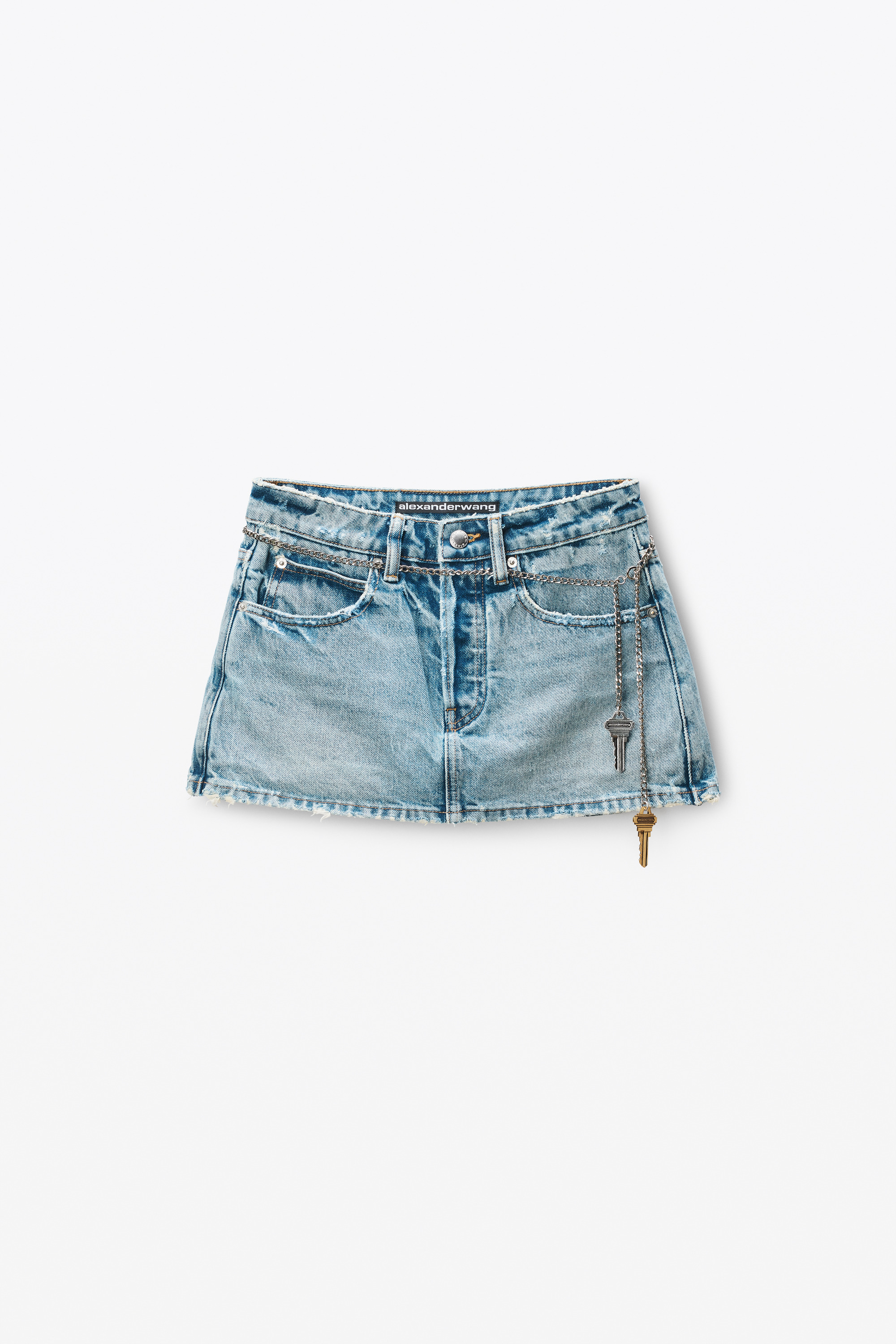 This high-rise skort in bleach blue denim features light distressing at the pockets, waistband, and hem. It has fitted shorts that give the appearance of a miniskirt from the front. - five-pocket style - front fly - composition: 100% cotton - made in china - model is 5’11" and wears a size 27 - 4DC3255824470C composition Body: 100%COTTON