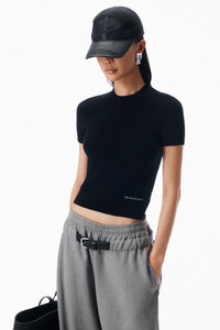 Black extra-soft wool tee in a classic fitted short-sleeve silhouette. Detailed with a technical knit logo patch on the left side above the rib. A streamlined base layer with a subtle branded touch. - Black - Crewneck - short sleeves - hits at hip - straight hem - Body composition: 100% wool - Rib trim: 89% wool/10% polyamide/1% elastane - model is 5'11" and wears a size s - made in china - 4KC1261114001 composition Body: 100%WOOL (OVIS ARIES ARIES) Rib Trim: 89%WOOL (OVIS ARIES ARIES)/10%POLYAMIDE/1%ELASTANE