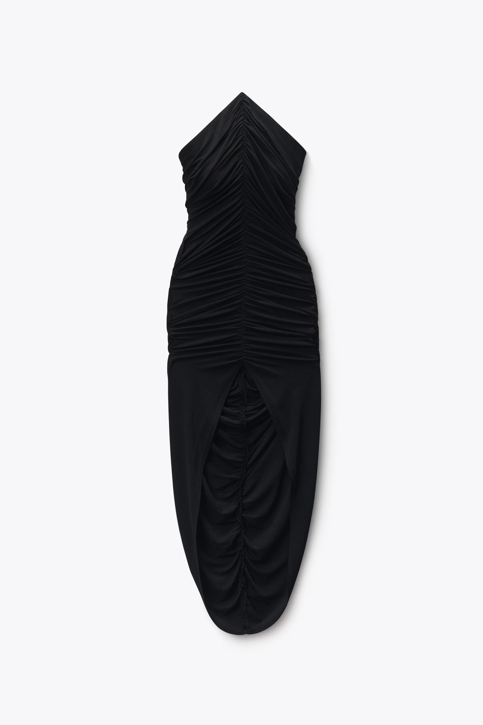 Black structured bodice dress in crepe matte jersey. Defined by a strapless ruched bust and corseted interior that shape the silhouette, finished with a high-low hem for added movement. - Black - strapless - Invisible zipper - Hi-Low Hem - Body composition: 98% viscose/2% elastane - Lining: 75% polyamide /25% elastane - Made in China - Model is 5'11" and Wears a Size 4 - 1CC1266893001 composition Body: 98%VISCOSE/2%ELASTANE LINING: 75%POLYAMIDE/25%ELASTANE