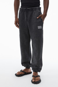 classic sweatpant with repeat printed logo on left leg in acid black treated dense fleece - drawcord waistband - unisex jogger fit - elasticated ankles - composition: 68% cotton / 32% polyester - made in china - model is 6'1" and wears size m - UCC3224049007