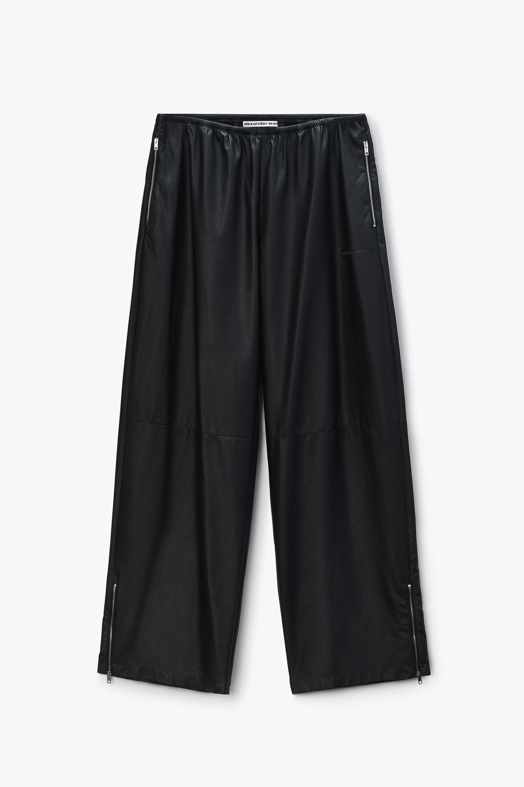 Relaxed fit leather trackpants with a bonded paper surface and soft structure. Mid-rise shape with elastic waistband, interior drawcord, and slight stacking at the hem. Finished with tonal logo embroidery at the left thigh. - Black - side seam pockets - unlined construction - body composition: lambskin - body 2: 100% polyester - lining: 100% viscose - Female Model is 5'11" and Wears a Size S - Male Model is 6'1" and wears a size M - Made in India - UWC1264438001 composition Body Face: 100%LAMBSKIN (OVIS ARIES ARIES) Body Back: 100%POLYESTER Lining: 100%VISCOSE
