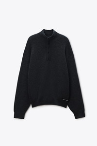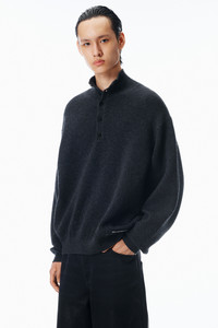 Black wool turtleneck henley crafted from extra-soft knit. Finished with a button placket of real horn buttons and a technical knit logo label above the rib. - Charcoal - Long sleeves - Henley placket, horn buttons - Logo label - Rib trim - Body composition: 89% wool/ 9% polyamide/2% elastane - Trim: 89% wool/10% polyamide/1% elastane - Made in China - Model is 6'1" and Wears a Size M - 6KC1261054001 composition Body: 89%WOOL (OVIS ARIES ARIES)/9%POLYAMIDE/2%ELASTANE Trim: 89%WOOL (OVIS ARIES ARIES)/10%POLYAMIDE/1%ELASTANE