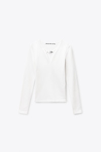 Fitted long-sleeve pullover in matte rayon jersey. Designed with a clean split V-neckline and polished metal logo plate at center chest. - Soft White - long sleeves - bodycon silhouette - body composition: 75% viscose/23% polyamide/2% elastane - trim: 75% viscose/23% polyamide/2% elastane - Made in Vietnam - Model is 5'11" and Wears a Size S - 1KC1261095104 composition Body: 75%VISCOSE/23%POLYAMIDE/2%ELASTANE Trim: 75%VISCOSE/23%POLYAMIDE/2%ELASTANE