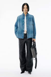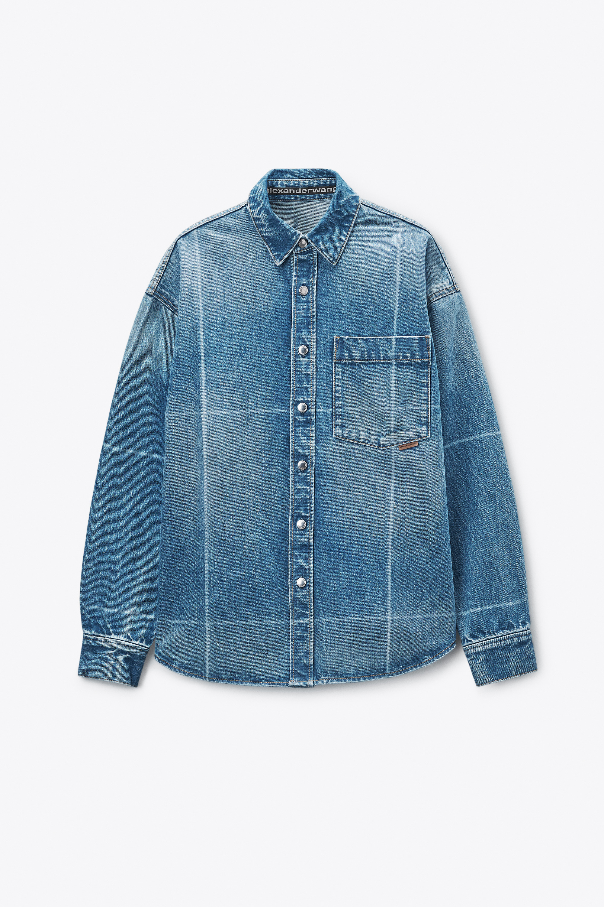 Button-down shirt in vintage marbled blue indigo denim, finished with hand-sanded foldlines reinforced from the inside for a crisp, pressed look. Designed with a straight oversized fit, dropped shoulders, and denim shank placket, it’s detailed with a patch pocket and tan logo flag at the hem. - denim shank button placket - dropped shoulders - patch pocket with tan logo flag - straight oversized silhouette - body composition: 100% cotton - model is 5'11" and wears a size S - made in China - 4DC4252847400C composition Body: 100%COTTON