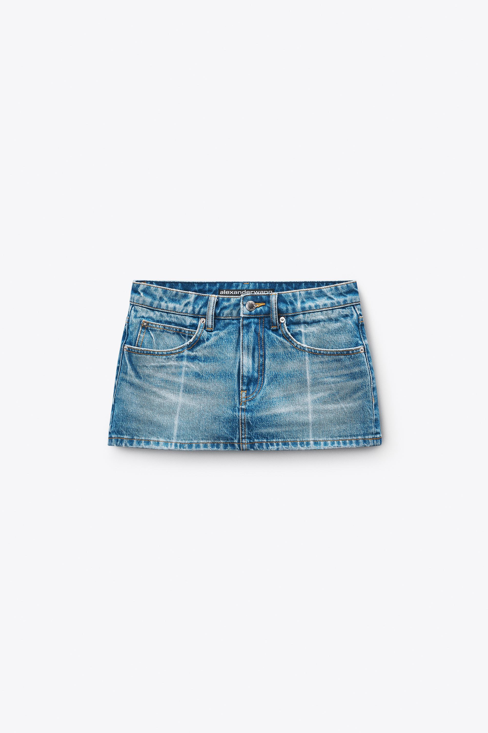 Mini skort in vintage marbled blue deep indigo denim, designed with hand-sanded foldlines reinforced by interior fusible for a crisp, pressed effect. Features a fully constructed under short, classic five-pocket styling, and a tan logo patch at the back pocket. - belt loops - zip fly, button closure - five-pocket style - mid-rise fit - body composition: 100% cotton - made in China - model is 5'11" and wears a size 27 - 4DC4255914400C composition Body: 100%COTTON