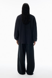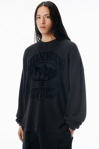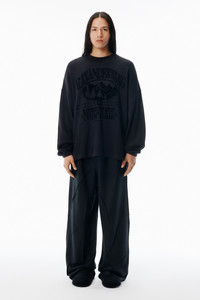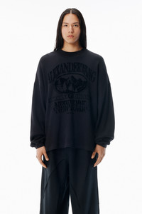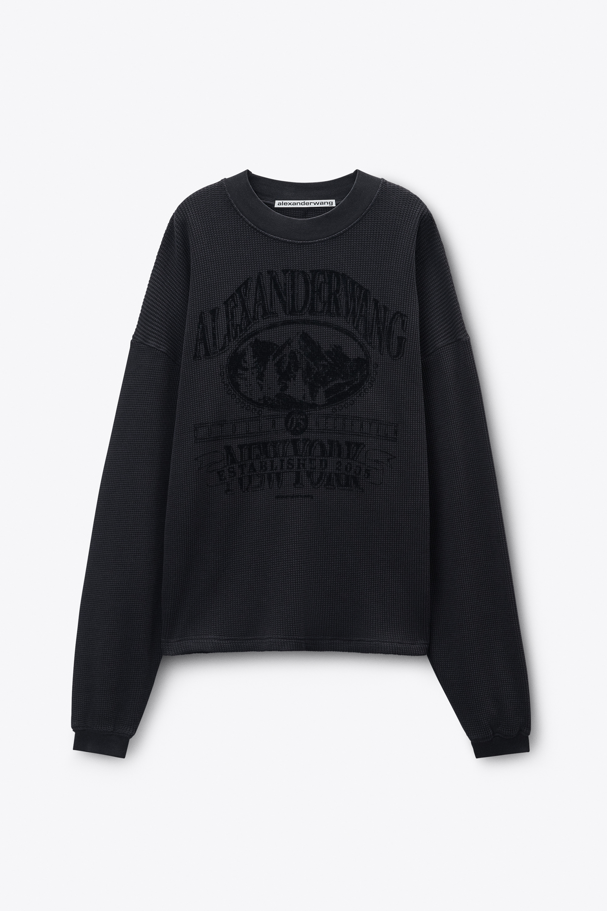 Oversized long sleeve T-shirt crafted in washed black waffle jersey with a boxy silhouette. Features ribbed cuffs and hem, and a seasonal outdoor recreation graphic at the chest. - unisex fit - crewneck - long sleeves - body composition: 100% cotton - oversized fit - female model is 5'11" and wears a size S - male model is 6'1" and wears a size m - made in Portugal - UCC4251861011 composition Body: 100%COTTON Rib: 98%COTTON/2%ELASTANE