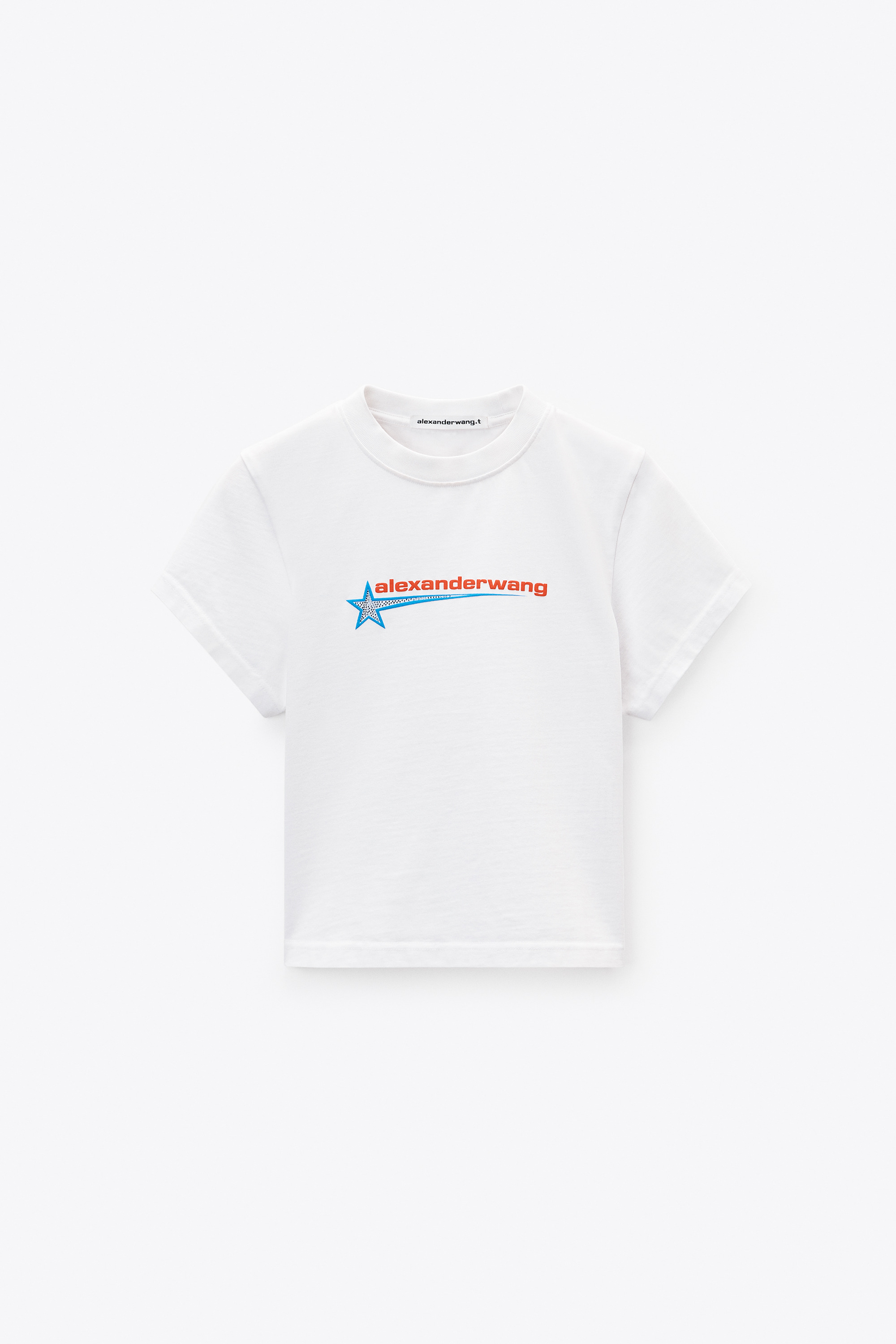 Unlined shrunken short‑sleeve tee in washed white compact cotton jersey, featuring a ribbed crewneck and crystal‑hotfix star graphic. - crewneck - short sleeves - shrunken fit - body compostion: 100% cotton - made in portugal - model is 5'11" and wears a size s - 1CC4251155100 composition Body: 100%COTTON Rib: 98%COTTON/2%ELASTANE