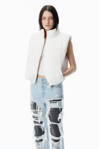 White essential nylon puffer vest with a stand collar and bodycon-inspired lines. Downbag filled for warmth, it features tonal logo embroidery at the chest, a two-way zip front, and a bungee drawcord hem for adjustable shape. - stand collar - bodycon-style seam lines - two-way front-zip closure - front pockets - internal welt pocket - bungee drawcord hem - relaxed fit - body composition: 71% polyester / 29% polyamide - lining: 100% polyamide - model is 5'11" and wears a size s - made in China - 1WC4252709100 composition Body: 71%POLYESTER/29%POLYAMIDE Lining: 100%POLYAMIDE Filling: 75%DOWN/25%FEATHER Filling 2: 100%POLYESTER