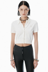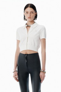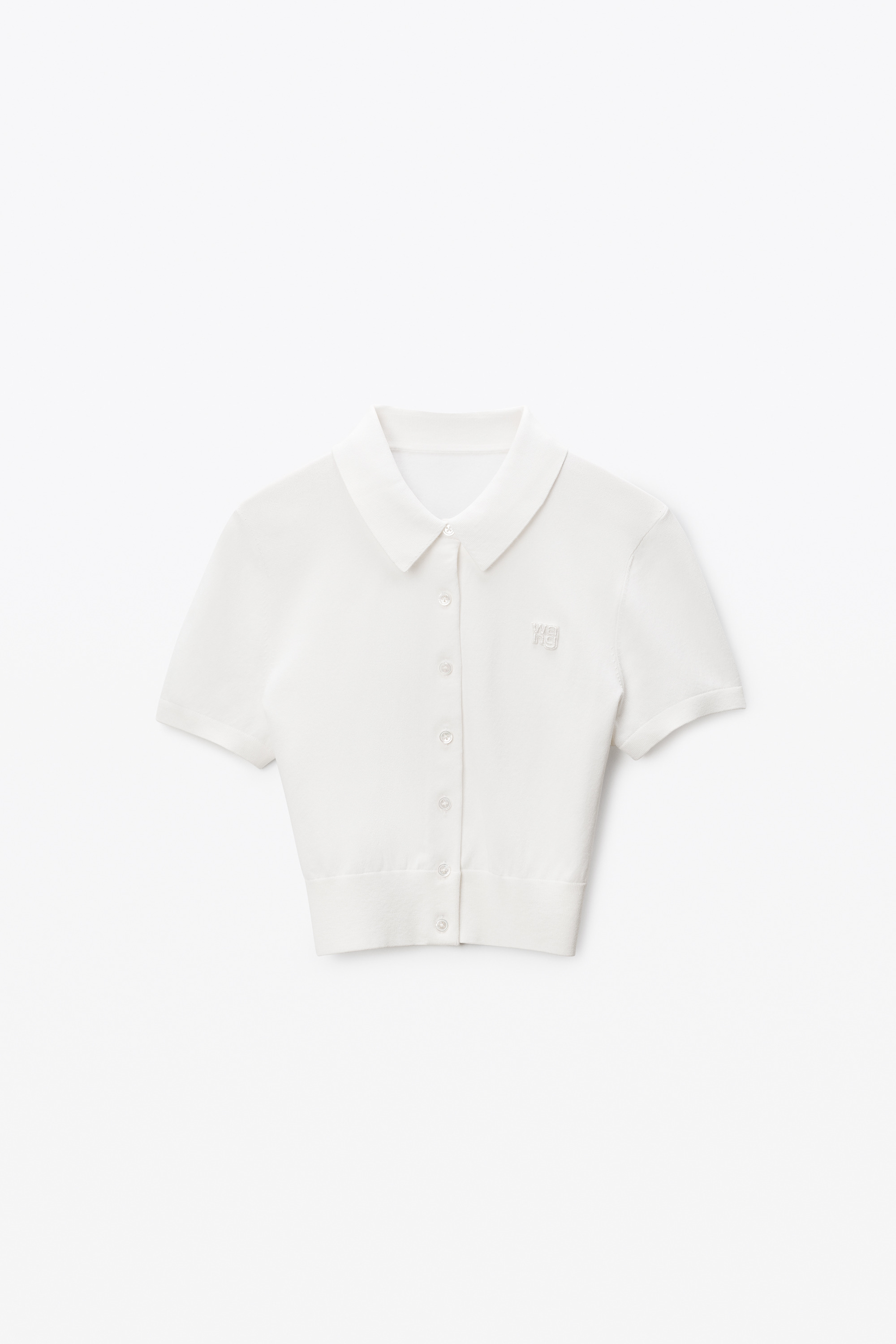 Logo embroidery at the chest elevates this short-sleeve polo cardigan in soft white. It fastens with shell buttons and is detailed with rib trims at the cuffs and hem. - cowlneck - short sleeves - button placket - body composition: 73% viscose/22% polyamide/5% elastane - trim: 86% viscose/13% polyamide/1% elastane - made in vietnam - model is 5'11" and wears a size s - 4KC3253065104 composition Body: 73%VISCOSE/22%POLYAMIDE/5%ELASTANE Trim: 86%VISCOSE/13%POLYAMIDE/1%ELASTANE