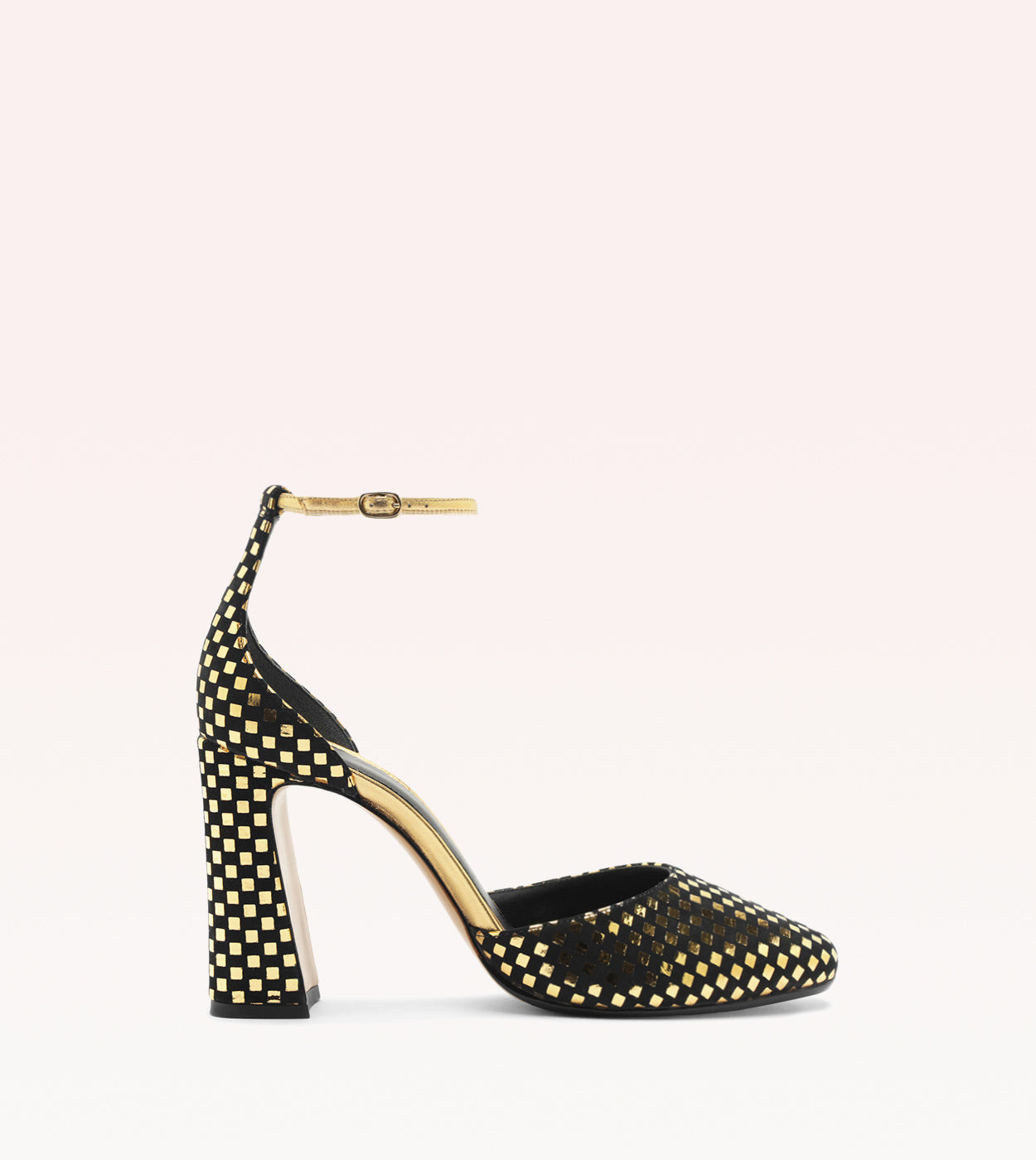 Introducing Thalita Block 90 Oro - where visual impact meets comfort. With a striking and bold design, this platform family offers versatility for any occasion. Crafted with exclusive metallic plaid leather and an elegant vamp, its metallic-edged heel adds a touch of sophistication. Heel Style: Block Hell Height: 3,5 In | 90 mm Square Toe Material: Leather | Leather Sole SKU: B3574700080002