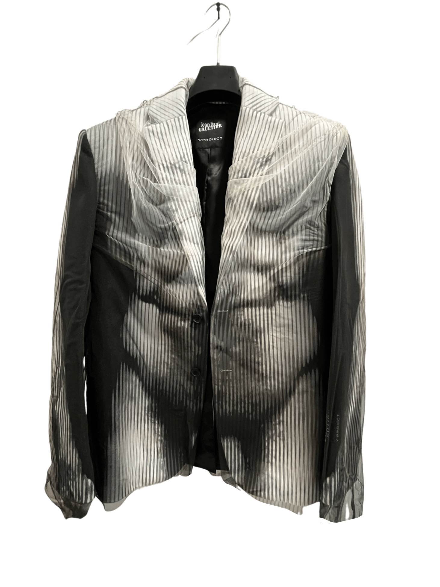 One of the most sought after pieces from Y/Project and JPG PFW22 collaboration. Y/Project × Jean Paul Gaultier reimagines vintage JPG illusionary graphics through Glenn Martens' experimental lens. The Body Morph Blazer is crafted from a technical blend fabrication in a close weave, featuring peak lapels, concealed single button fastening, all-over graphic motif and tulle overlay. Technical blend fabrication in a close weave Peak lapels Concealed single button fastening Long sleeves All-over graphic motif Tulle overlay Brand new with tags Size S or 36R Worldwide shipping available!