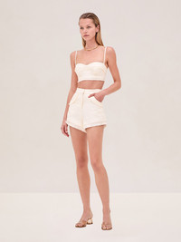The Allyn Short is a high waisted style designed with framed raffia pockets and hem details, paired with the Drita Top. Model Measurements Height: 5'10" Bust: 34B Waist: 25" Hips: 35” Model wears an XS