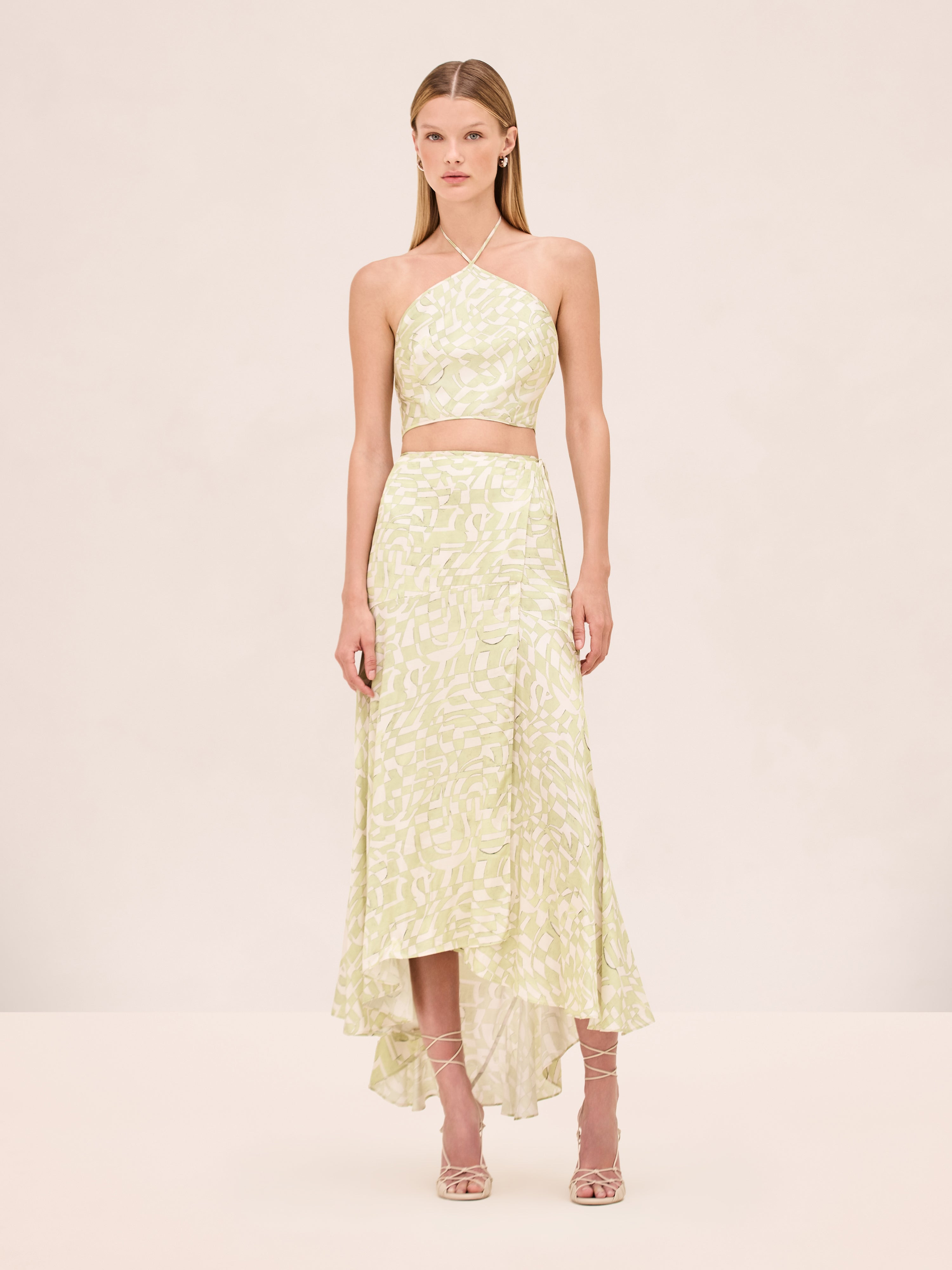 The Alzena Skirt is a high-low wrap silhouette featuring an abstract print, paired with the Nali Top. Model Measurements Height: 5'10" Bust: 34B Waist: 25" Hips: 35” Model wears an XS