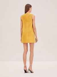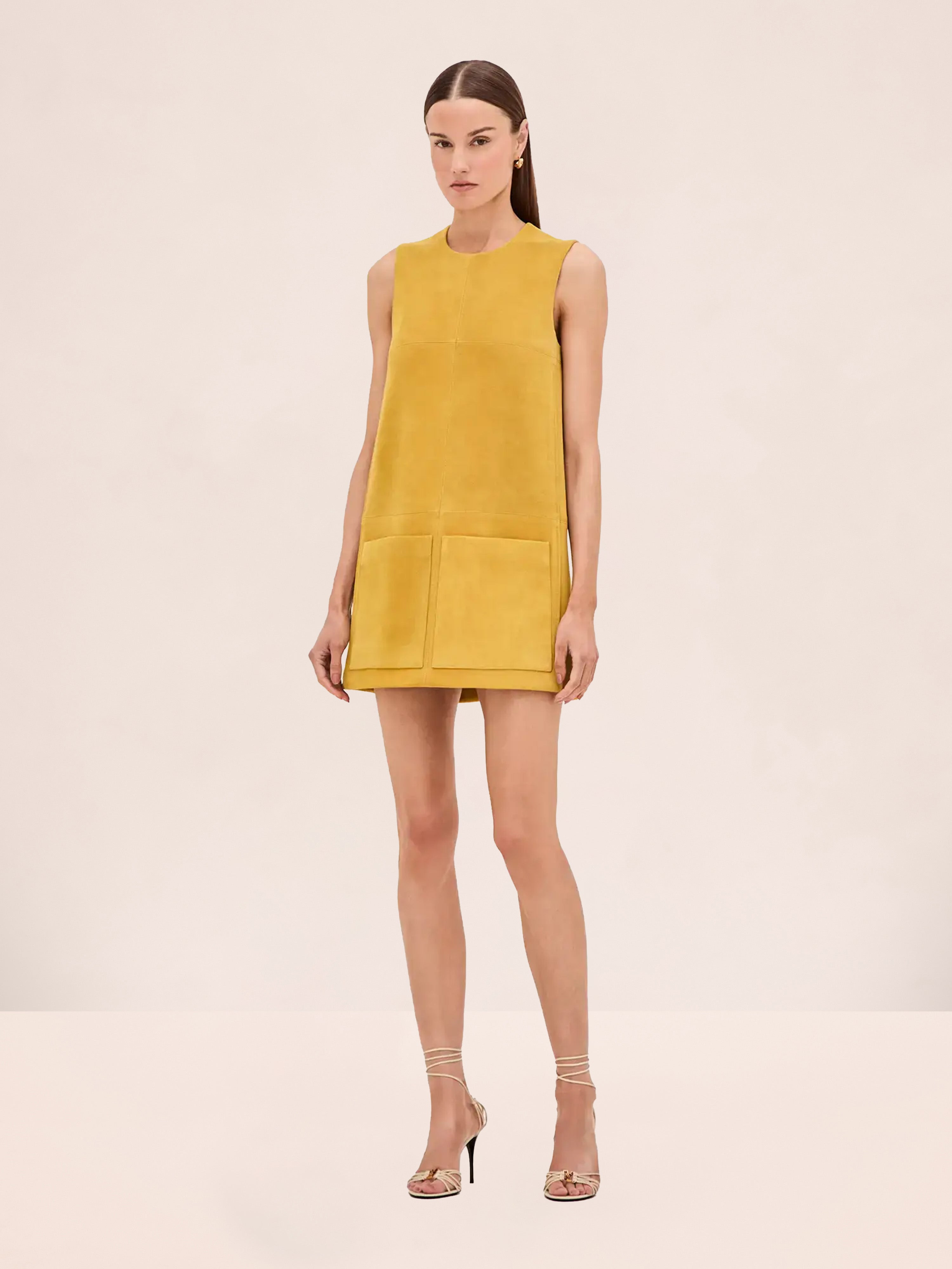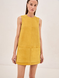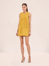 The Dakota Dress is a sleeveless mini silhouette featuring clean lines and bold front patch pockets. Model Measurements Height: 5'10" Bust: 34B Waist: 25" Hips: 35” Model wears an XS