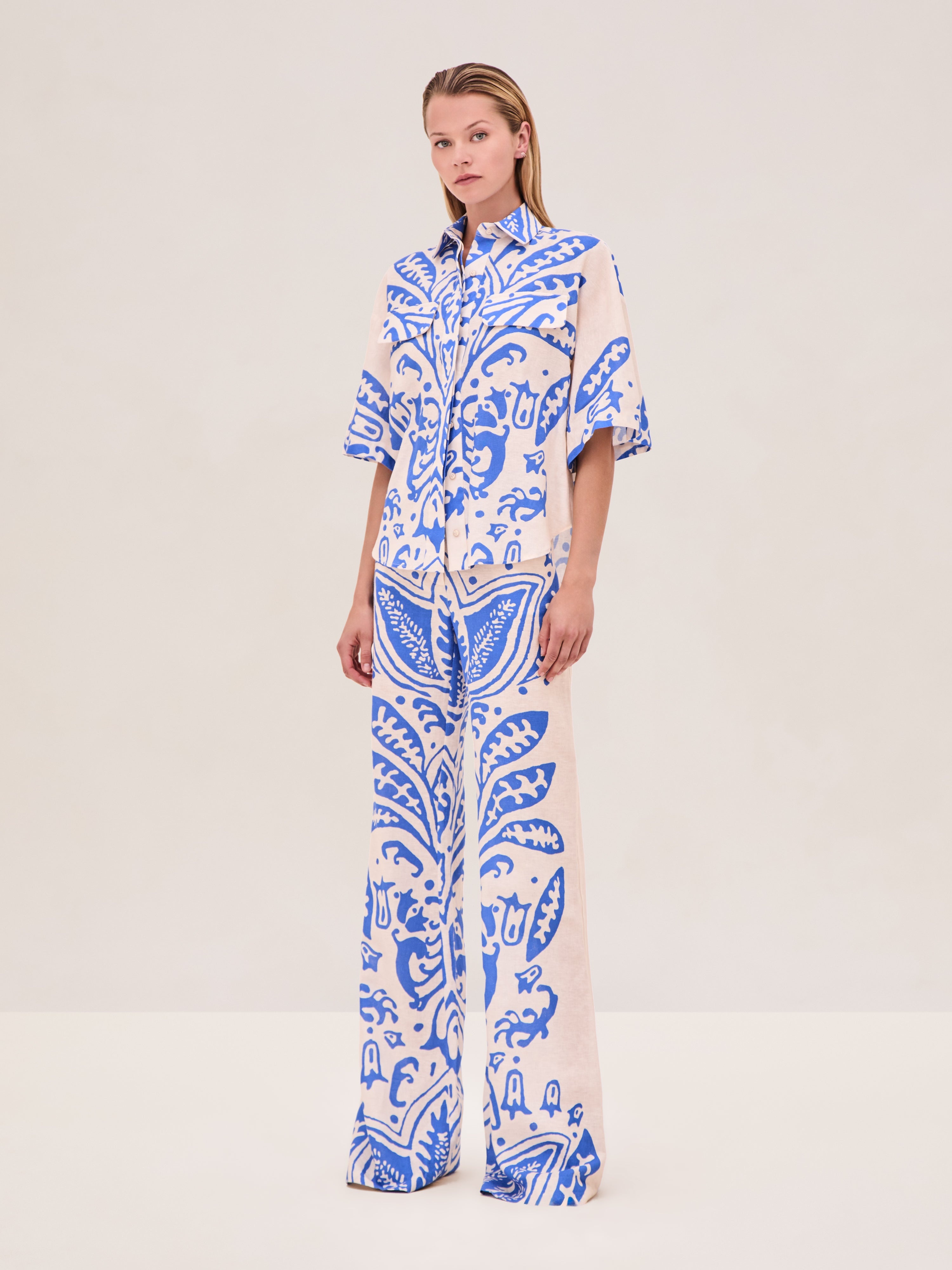 The Davi Pant is a printed design crafted from a cotton-linen blend, paired with the Farad Top. Model Measurements Height: 5'10" Bust: 34B Waist: 25" Hips: 35” Model wears an XS