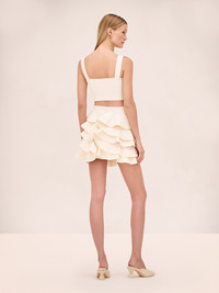 The Dee Top is a structured cropped top design, paired with the Arli Skirt. Model Measurements Height: 5'10" Bust: 34B Waist: 25" Hips: 35” Model wears an XS
