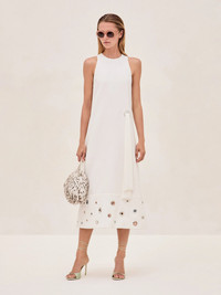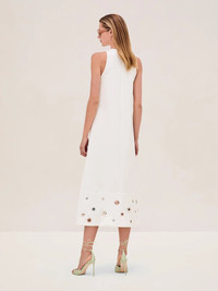 The Delfin Dress is a modern shift style with elevated details. Crafted in a clean, sleeveless silhouette, it features a unique side tie and an embellished hem with grommet accents for a touch of contemporary edge. Perfect for daytime events or evening occasions, this dress pairs effortlessly with strappy heels and a statement bag to complete the look. Model Measurements Height: 5'10" Bust: 34B Waist: 25" Hips: 35” Model wears an XS