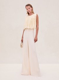 The Dorett Top is a sleeveless, pleated georgette blouse, paired with the Verio Pant. Model Measurements Height: 5'10" Bust: 34B Waist: 25" Hips: 35” Model wears an XS
