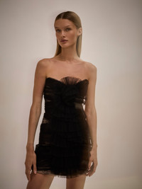 The Eva Dress is a strapless mini dress with tiered tulle detailing. Model Measurements Height: 5'10" Bust: 34B Waist: 25" Hips: 35” Model wears an XS