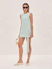 The Eyden Dress is a classic shift style with a modern twist. Designed in a sleek, sleeveless silhouette and a soft azure hue, it features a minimalist side tie detail that adds a touch of elegance. Perfect for daytime outings or evening events, this versatile dress pairs effortlessly with sandals or heels for a clean, polished look. Model Measurements Height: 5'11" Bust: 32 Waist: 24" Hips: 34” Model wears XS.