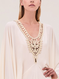 The Genevive Dress is a fluid crepe gown featuring a hand-beaded necklace at the neckline and long, flowy sleeves. Model Measurements Height: 5'10" Bust: 34B Waist: 25" Hips: 35” Model wears an XS