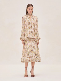 Introducing the Hilana Dress, a statement piece that marries vintage charm with modern flair. This dress features a chic necktie detail, a captivating polka-dot print that feels both playful and sophisticated, and a flowing silhouette. The ruffled accents at the cuffs and hem add a touch of romance, making this dress a must-have for any occasion. Model wears XS Model Measurements Height: 5'10" Bust: 34B Waist: 25" Hips: 35”