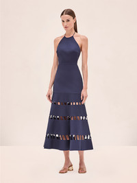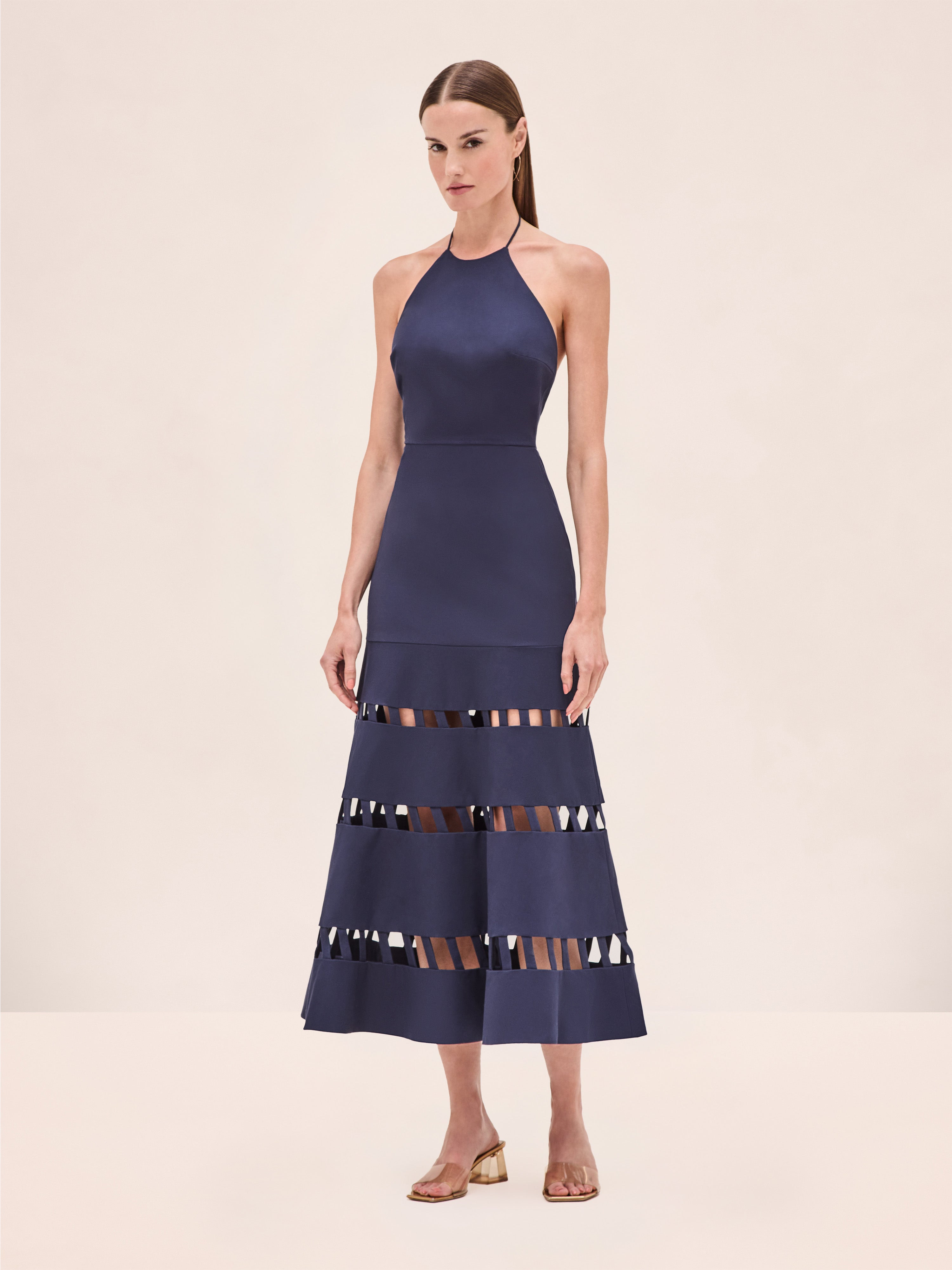 The Janessa Dress is a cotton halter midi design featuring cut-out ladder detailing. Model Measurements Height: 5'10" Bust: 34B Waist: 25" Hips: 35” Model wears an XS