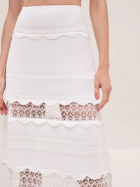 The Jeannie Skirt is a scalloped trim knit skirt featuring lace inserts, paired with the Lise Top. Model Measurements Height: 5'10" Bust: 34B Waist: 25" Hips: 35” Model wears an XS