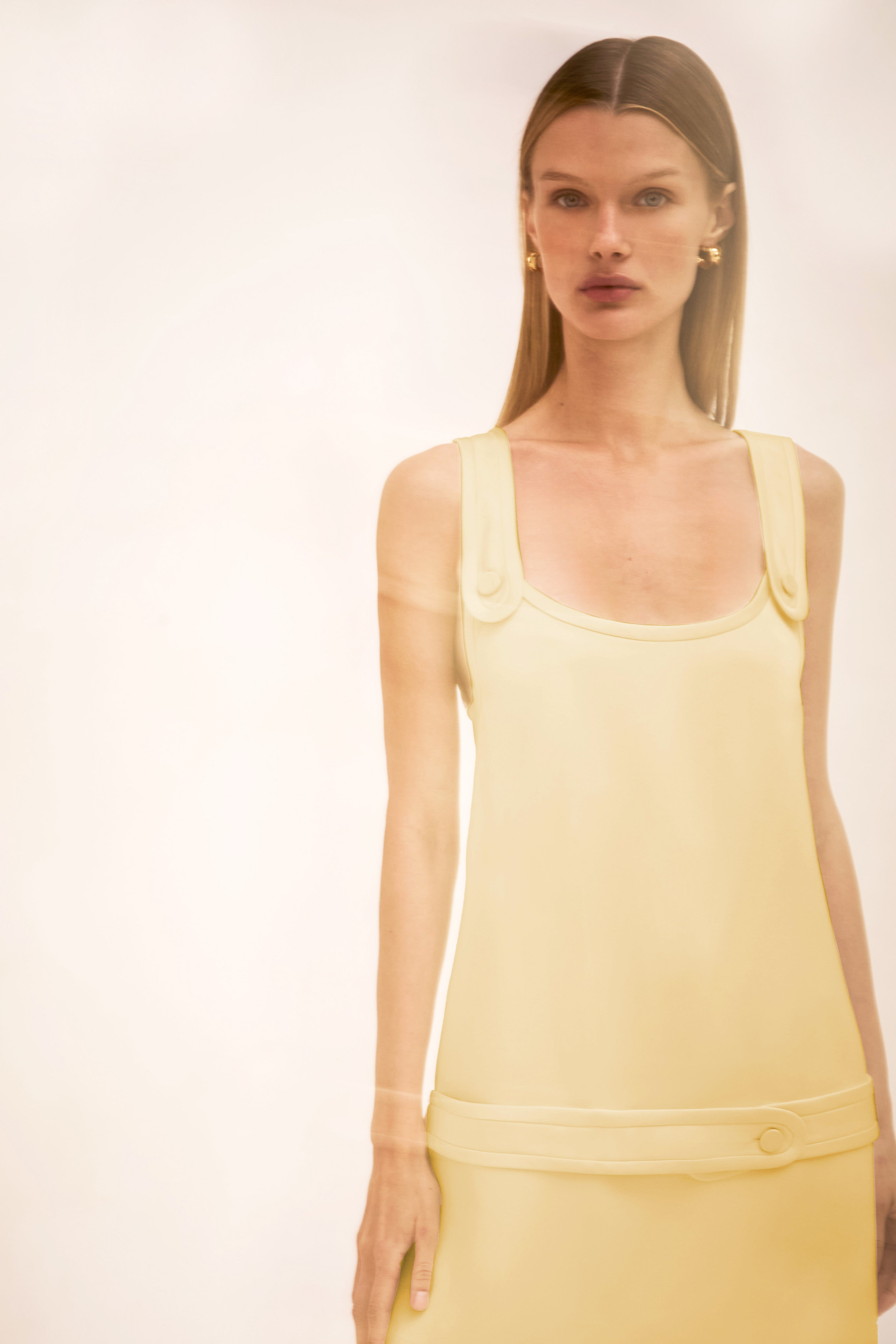 The June Dress is a sleeveless mini silhouette featuring buttoned strap and waist detailing. Read more Model Measurements Height: 5'10" Bust: 34B Waist: 25" Hips: 35” Model wears an XS Read more