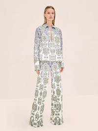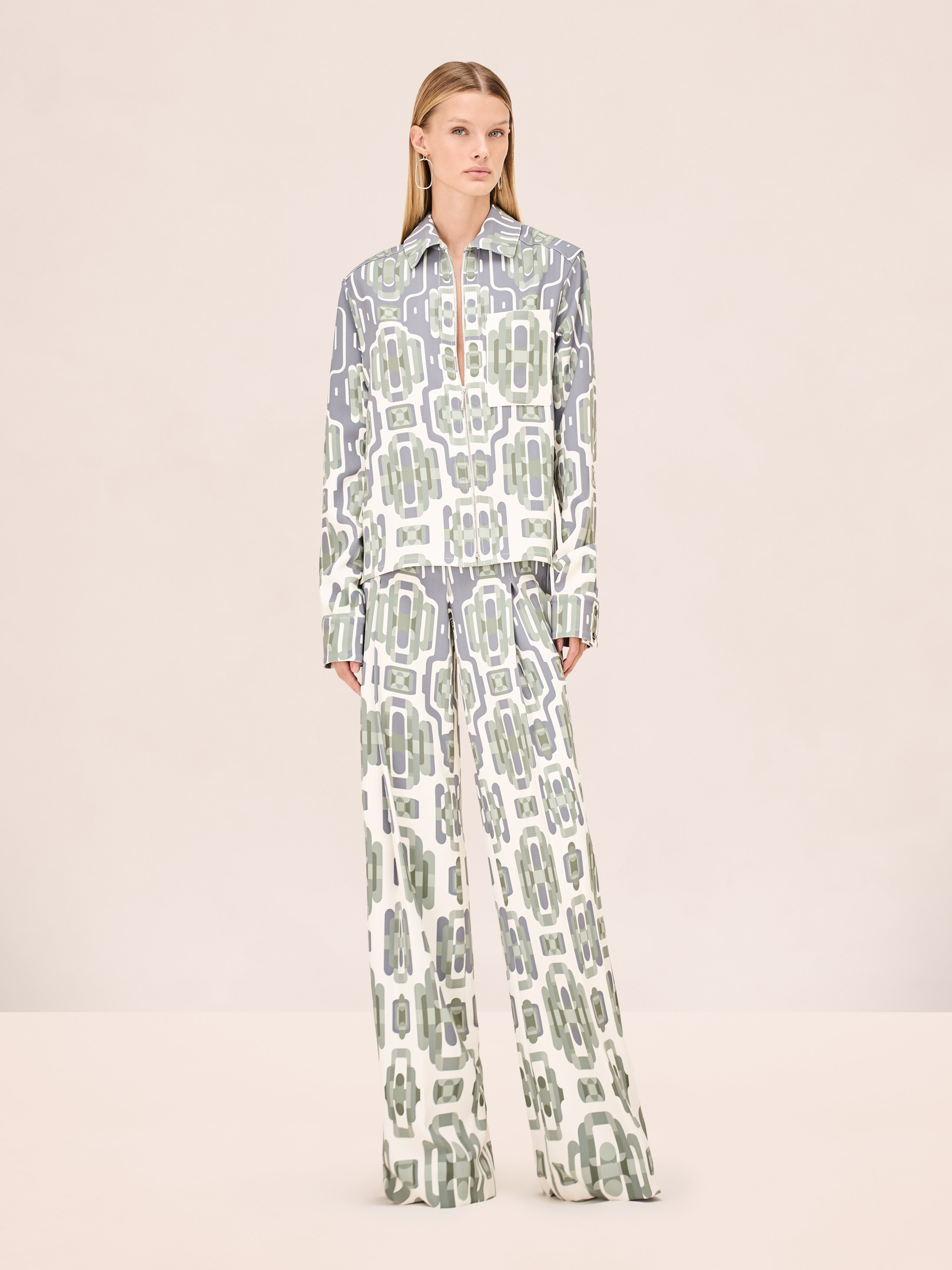 The Kalisz Jacket is a collared zip-up jacket with a geometric print and a front patch pocket, paired with the Salerno Pant. Model Measurements Height: 5'10" Bust: 34B Waist: 25" Hips: 35” Model wears an XS
