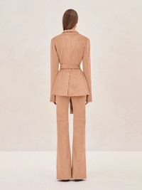 The Lazlo Vegan Suede Blazer features a sleek, structured silhouette with a deep collar and button-front closure. The adjustable waist tie cinches the waist, adding a flattering shape and a touch of versatility. Designed to pair perfectly with the Byers Pant. Model Measurements Height: 5'10" Bust: 34B Waist: 25" Hips: 35” Model wears an XS