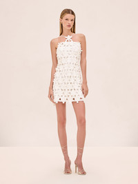 The Lily Dress is a halter mini silhouette featuring 3D floral detailing throughout. Model Measurements Height: 5'10" Bust: 34B Waist: 25" Hips: 35” Model wears an XS