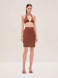 The Lotte Top is a halter crop top with a gold metal closure at the neck, paired with the Giotto Skirt. Model Measurements Height: 5'11" Bust: 32 Waist: 24" Hips: 34” Model wears XS.