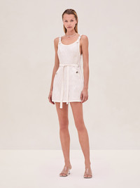 The Luccia Dress is a jacquard wrap mini dress with adjustable belt straps, finished with a tied belt at the waist and a subtle shine. Model Measurements Height: 5'11" Bust: 32 Waist: 24" Hips: 34” Model wears XS.