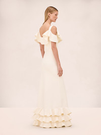 The Lucy Dress is a sculptural silhouette featuring layered ruffle detailing and a flounced neckline. Read more Model Measurements Height: 5'10" Bust: 34B Waist: 25" Hips: 35” Model wears an XS Read more