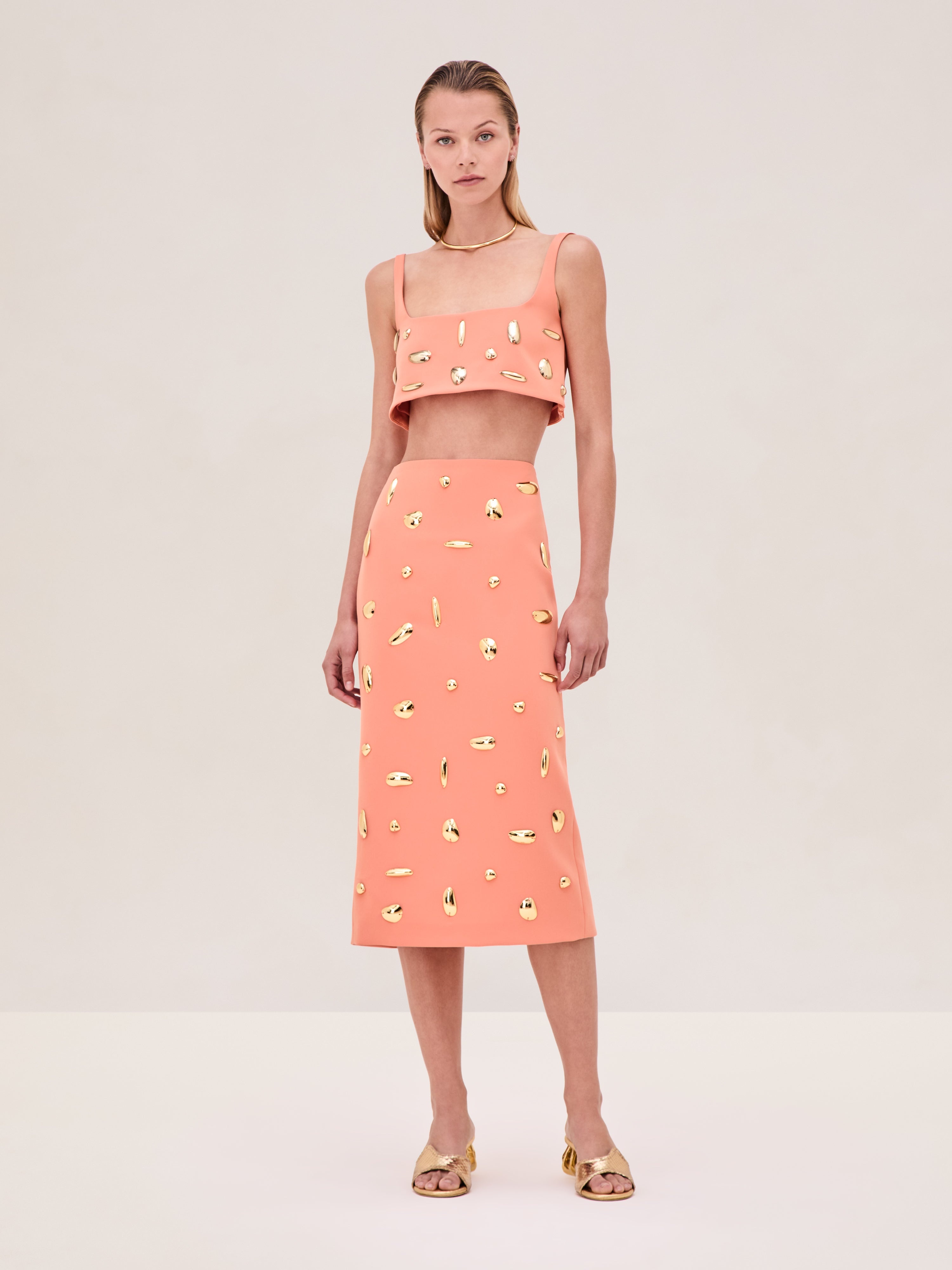 The Lya Top is a crepe crop top with gold hand-sewn appliques, paired with the Kanya Short and Pamila Skirt. Model Measurements Height: 5'10" Bust: 34B Waist: 25" Hips: 35” Model wears an XS