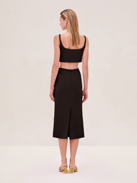 The Lya Top is a crepe crop top with gold hand-sewn appliques, paired with the Kanya Short and Pamila Skirt. Model Measurements Height: 5'11" Bust: 32 Waist: 24" Hips: 34” Model wears XS.