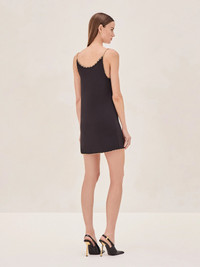 This sleek black mini is adorned with delicate gold chain detailing along the neckline and hem, adding a touch of edge to its minimalist design. This flattering silhouette, that can be cinched with the Macchi belt, perfectly balances elegance and allure. Styled with our Macchi Belt, sold separately. Model Measurements Height: 5'10" Bust: 34B Waist: 25" Hips: 35”