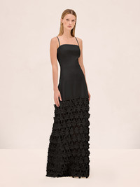 The Magdalena Dress is a fitted silhouette featuring a sheer cutout skirt with 3D floral appliques. Model Measurements Height: 5'10" Bust: 34B Waist: 25" Hips: 35” Model wears an XS