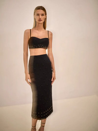 The Mili Top is a cropped bustier silhouette with beaded embellishments along the hem, paired with the Luisa Skirt. Model Measurements Height: 5'10" Bust: 34B Waist: 25" Hips: 35” Model wears an XS