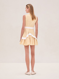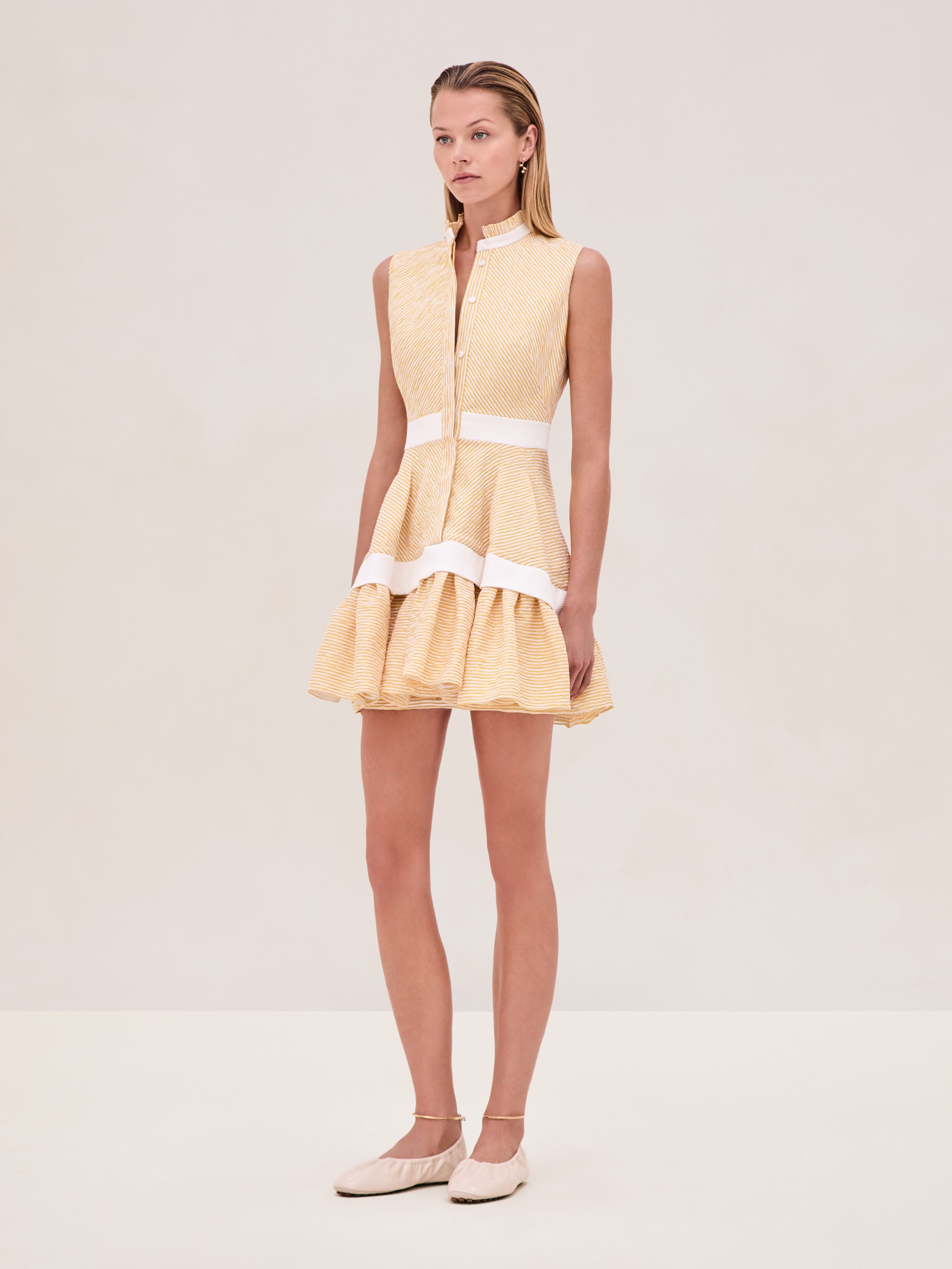 The Natacha Dress is a herringbone textured mini dress with a concealed placket, pleated skirt, and button-down front. Model Measurements Height: 5'11" Bust: 32 Waist: 24" Hips: 34” Model wears XS.