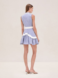 The Natacha Dress is a herringbone textured mini dress with a concealed placket, pleated skirt, and button-down front. Model Measurements Height: 5'10" Bust: 34B Waist: 25" Hips: 35” Model wears an XS