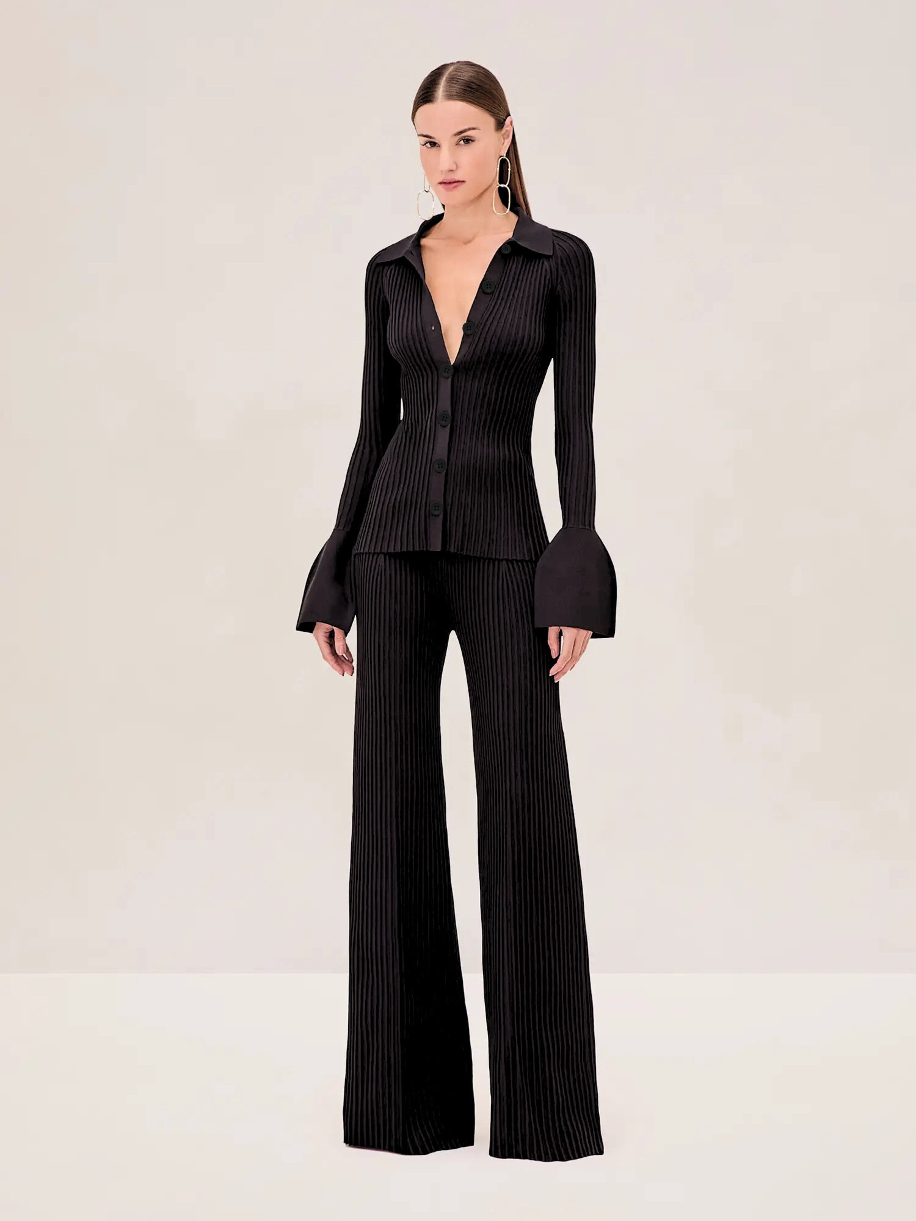 The Olena Top is a ribbed knit button-down with a collared neckline and flared cuffs, paired with the Boda Pant. Model Measurements Height: 5'10" Bust: 34B Waist: 25" Hips: 35” Model wears an XS