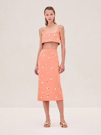 The Pamila Skirt is a high-waisted fitted midi with gold hand-sewn appliques, paired with the Lya Top. Model Measurements Height: 5'10" Bust: 34B Waist: 25" Hips: 35” Model wears an XS