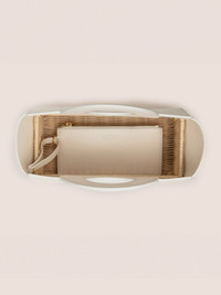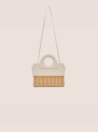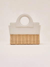 The Penelope hand bag is a blend of leather and handwoven rattan, featuring a structured silhouette. Designed with a removable interior leather pouch and a detachable crossbody strap for versatile styling. Model Measurements Height: 5'10" Bust: 34B Waist: 25" Hips: 35” Model wears an XS