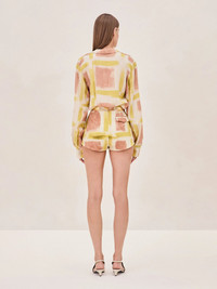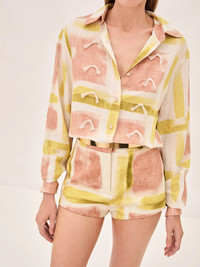 Meet the Perea Top, where laid-back luxury meets eye-catching detail. With its bold abstract print and relaxed fit, this top is all about effortless elegance. But it’s the subtle tassel details that truly set it apart, adding a playful touch to this sophisticated piece. For a look that’s as coordinated as it is chic, pair it with the Remm Shorts. Model Measurements Height: 5'10" Bust: 34B Waist: 25" Hips: 35” Model wears an XS