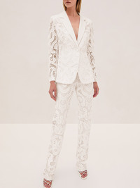 The Pierre Pants redefine suiting with their sophisticated lace detailing and tailored silhouette. Designed to elongate the legs with a flattering straight cut, these pants balance structure and elegance effortlessly. Pair them with the matching Lowel Jacket for a cohesive suiting look that’s both modern and refined. Model Measurements Height: 5'11" Bust: 32 Waist: 24" Hips: 34” Model wears XS.