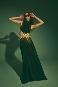 Introducing the Prague Dress, featuring a high neckline and a unique cut-out design. The fitted bodice transitions into a flowing skirt, connected by a distinctive gold detail at the waist. Model Measurements Height: 5'10" Bust: 34B Waist: 25" Hips: 35”