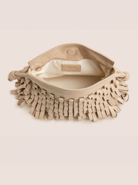 The Quinn clutch features a distinctive hand-woven leather fringe loop design, combining texture and craftsmanship in a compact silhouette. It includes a detachable crossbody strap for versatile styling and is secured with a magnetic and cinch closure. Model Measurements Height: 5'10" Bust: 34B Waist: 25" Hips: 35” Model wears an XS