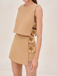 Introducing the Raylin Top. With its clean lines and modern silhouette, this top is elevated by the intricate floral appliques along the sides, adding a delicate, feminine touch. The simple yet refined design makes it a versatile piece that effortlessly transitions from day to night. For a perfectly coordinated look, pair the Raylin Top with the Susie Skirt. Model Measurements Height: 5'10" Bust: 34B Waist: 25" Hips: 35” Model wears an XS